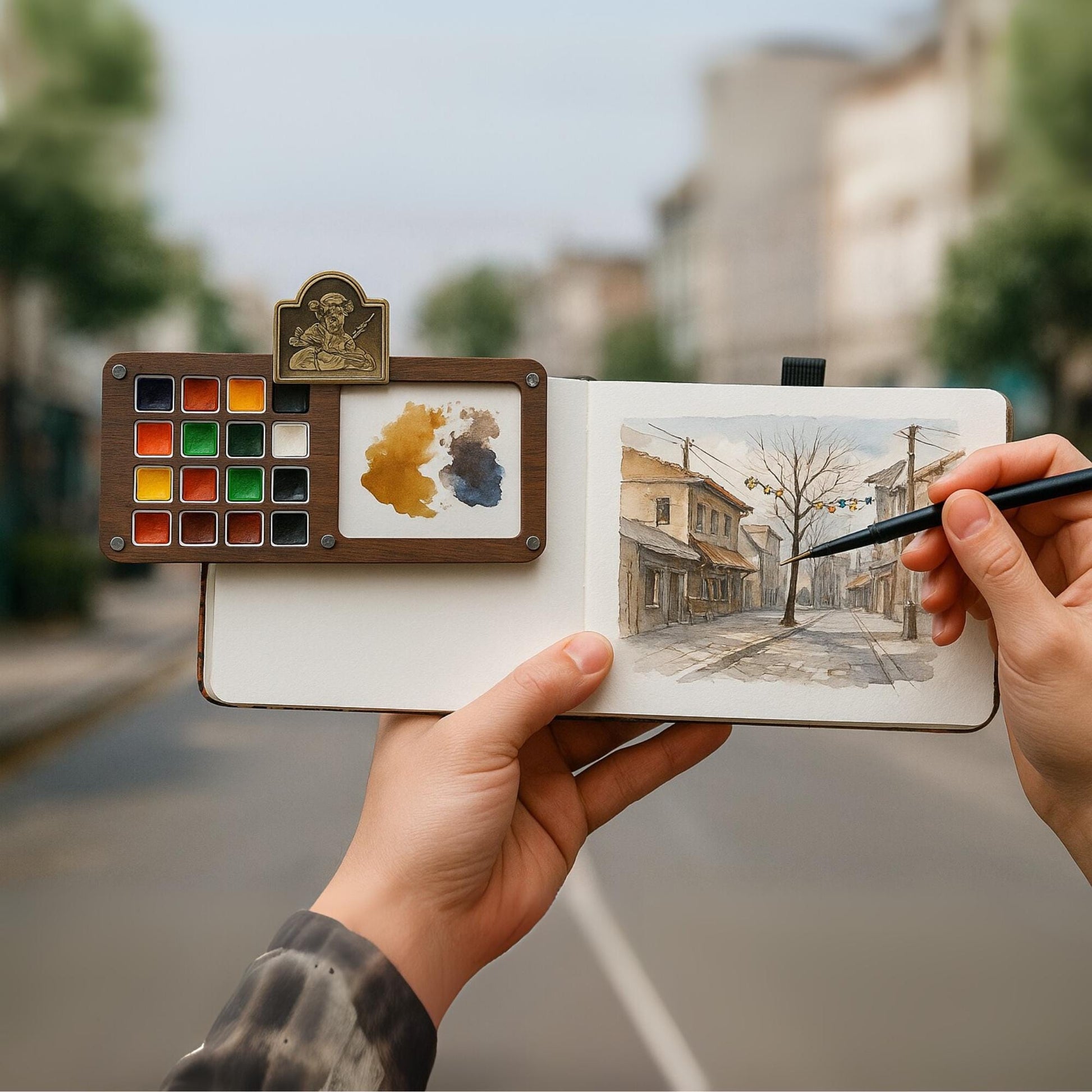 This 15-color watercolor paint set is perfect for artists who love to paint on the go. It includes a compact wooden palette, 15 vibrant watercolor pans, and a refillable water brush — all in a portable design that fits easily into your bag.
